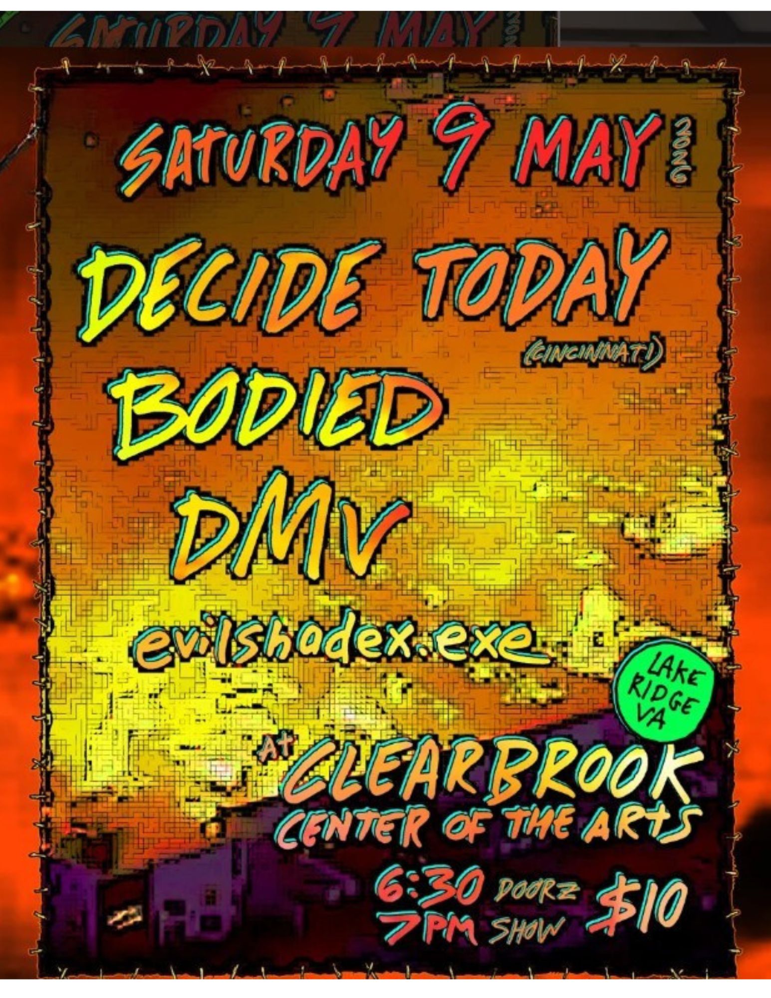 Bodied/DMV/Evilshadex.exe/Decide Today May 9th 6:30 PM Tickets $10 at the door. Bodied bodiednova.bandcamp.com DMV evilshadex.exe Decide Today + Add to Google Calendar + iCal / Outlook export 00 days 00 hours 00 minutes 00 seconds Search for: Search Contact Us 2230 B Tackett’s Mill Drive Lake Ridge, VA 22192 clearbrookcenterofthearts@gmail.com Office Hours By Appointment Only